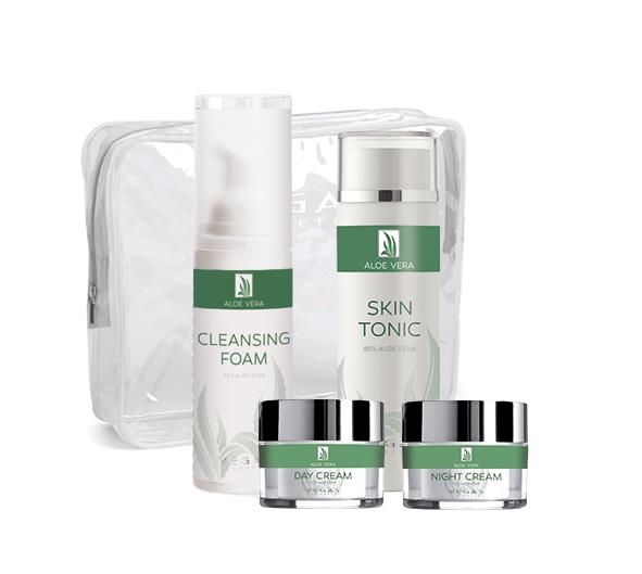 Conjunto composto por:Espuma de limpeza Aloe VeraTónico Facial Aloe VeraCreme de Dia Aloe VeraCreme de Noite Aloe VeraInclui Bolsa de Oferta