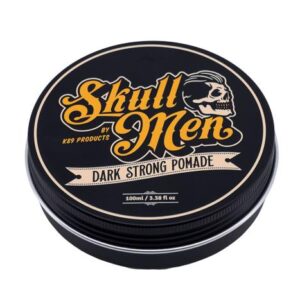 A Cera Skull Men Dark Strong proporciona uma fixação forte e um acabamento de cor preta que esconde os cabelos grisalhos em 70%.