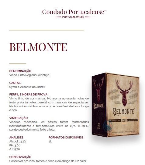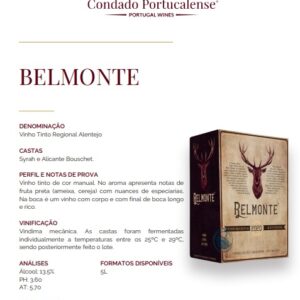 O vinho bag in box Belmonte é um vinho regional alentejano tinto produzido pelo Condado Portucalense da região de Lisboa. Este vinho apresenta uma cor rubi e no aroma apresenta notas de fruta preta (ameixa, cereja) com nuances de especiarias. Na boca é um vinho com corpo e com final de boca longo e rico.